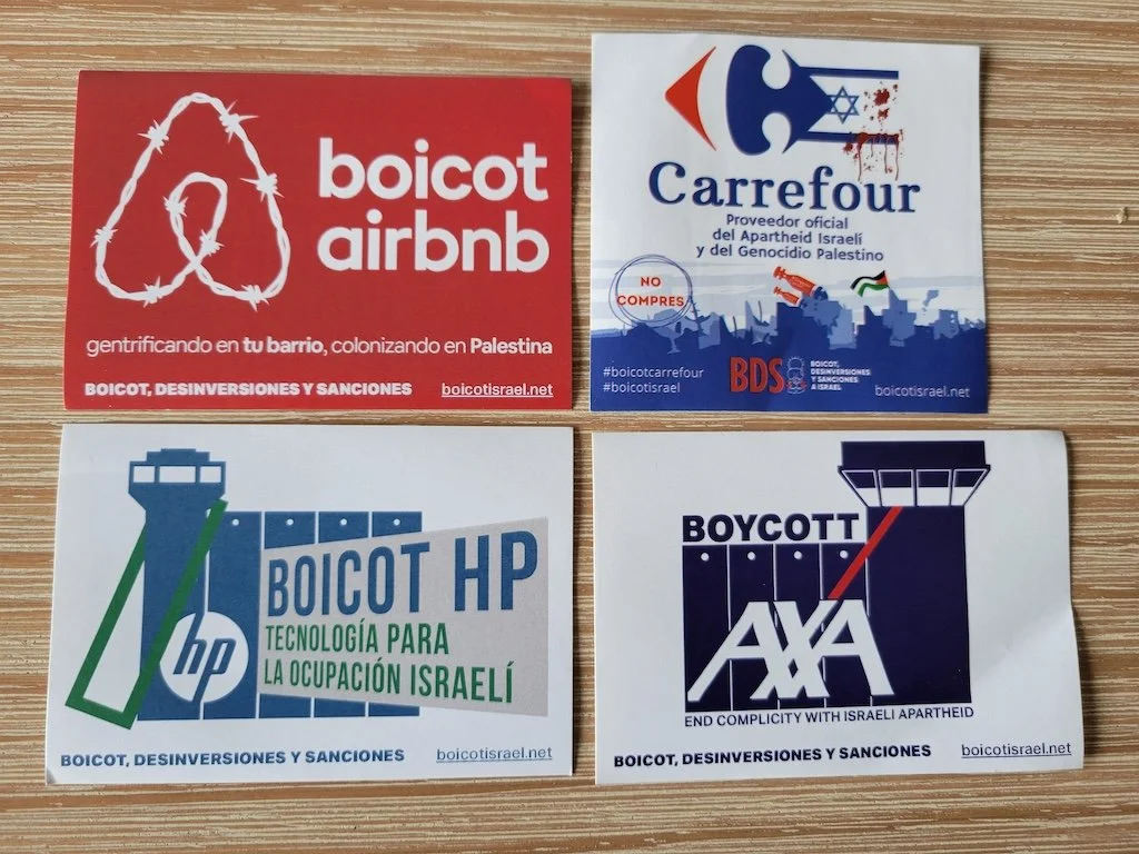 BDS stickers distributed at the Manal Tamimi event in Madrid. (Photo: John Collins/Weave News)