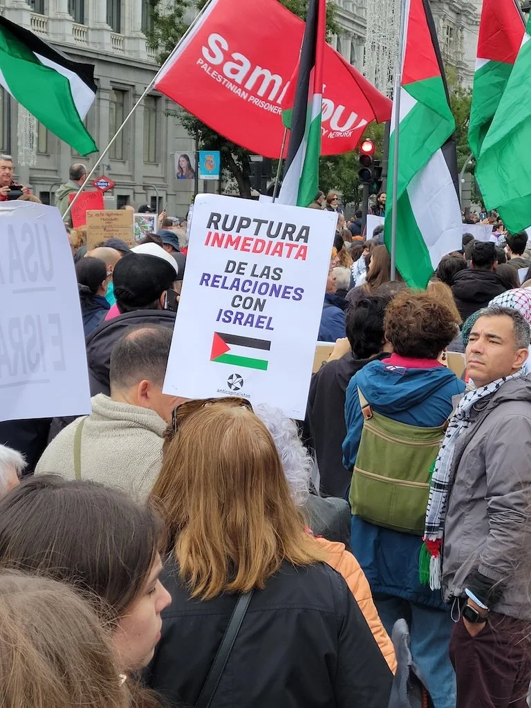 A sign at a Madrid demonstration in October 2023 calling for an immediate break of diplomatic relations with Israel. (Photo: John Collins/Weave News)
