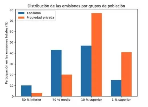 The figure below, taken from the first report, is illustrative in this regard. First, it shows that those groups with the highest income are those who pollute the most; and second, their contribution to the problem is even greater if, instead of consumption, we put the focus on property ownership, where responsibility of the top ten percent and the top one percent is even greater.