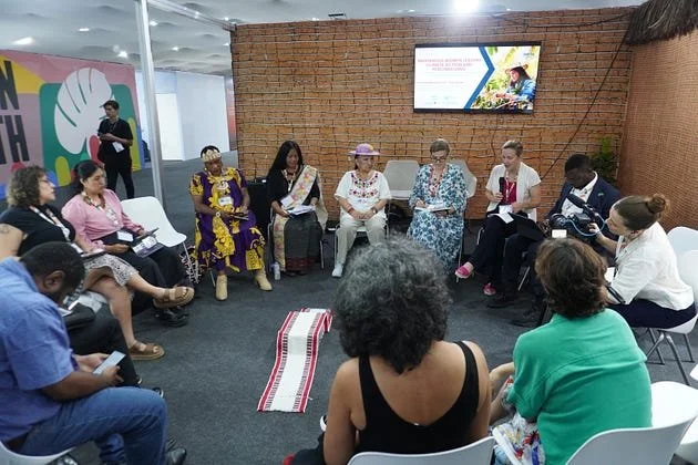 Participants at a COP30 side event focused on Indigenous women’s leadership in climate action and peacebuilding. 19 November 2025. (Photo: UN Women/Rodrigo Herrera)