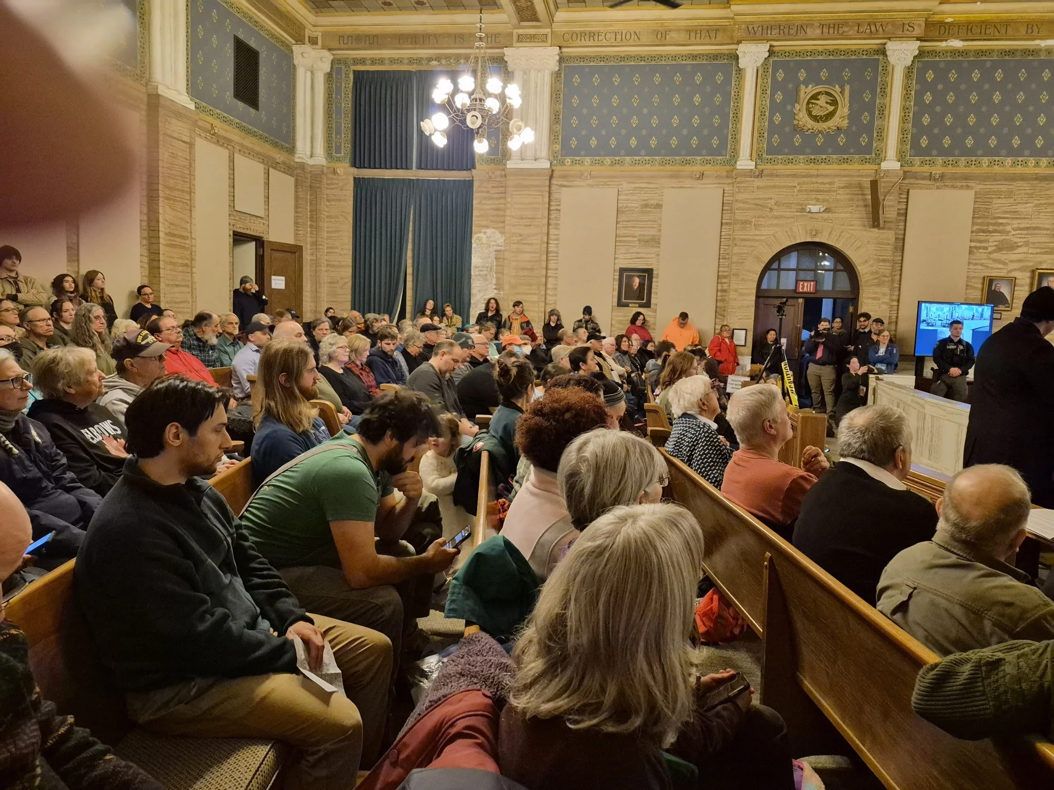 Courtroom C of the St. Lawrence County Courthouse in Canton, NY, was filled to overflowing on Monday evening, Feb. 2, 2026, for county legislators' vote on a proposed 287(g) agreement between ICE and local law enforcement. The agreement passed on an 11–4 vote, largely along party lines. (Photo: Sue Novak)