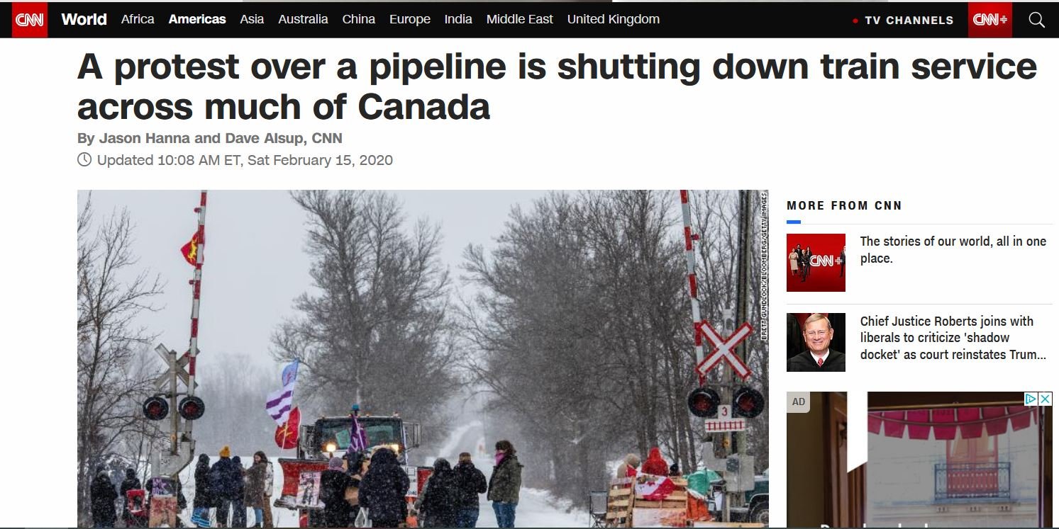 Screen capture of CNN report on protests in solidarity with Wet’suwet’en land defenders.