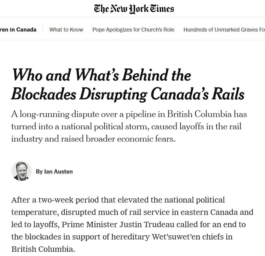 Screen capture of New York Times article providing background on the Wet’suwet’en story